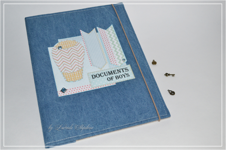 Обложки на паспорт и свидетельстваУже давно хотелось оформить папочку для документов на 2 свидетельства о рождении. Размер 20*27 см. Скомбинировала 2 вида ткани - джинс и лен (на задней стороне обложки). Проложена синтепоном и прошита на швейной машинке. Форзацы из скрап бумаги, 2 файла для свидетельств о рождении и по два кармашка (один прозрачный, второй из той же скрап бумаги) для каждого мальчишки.Закрывается на резинку