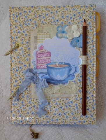 Блокнот делала на заказ в подарок сестренке заказчицы. Из пожеланий были состаренные листики, закладочка, без объемного декора на обложке и петелька для карандашика. Всё что просили - выполнила. Цветовую гамму подбирала под листики, которые вымачивала в ароматном кофе. Разделители сделала золотыми - очень красиво смотрится и сочетается с коричневым. Жаль, что фото не передает всей прелести... Надеюсь, хозяйке понравится такой подарок и она с радостью будет пользоваться этим блокнотиком!