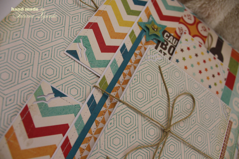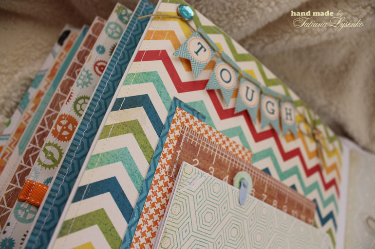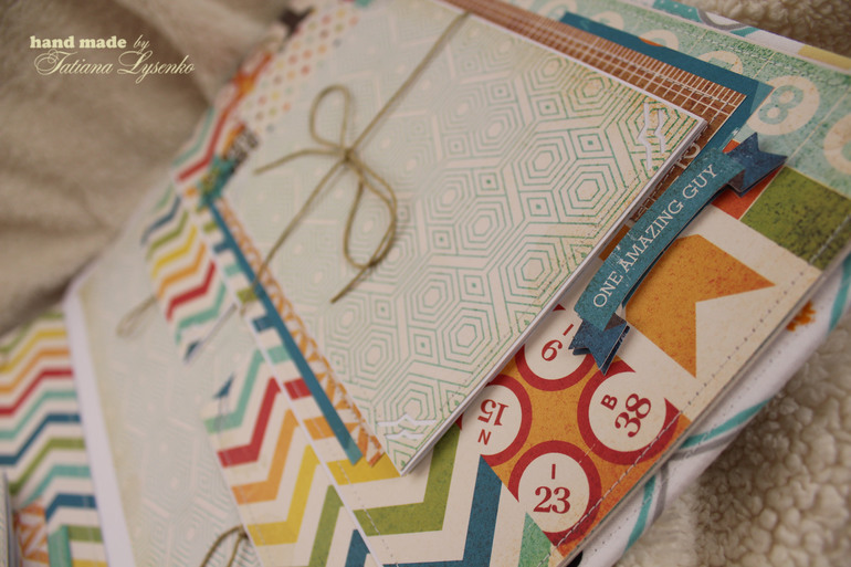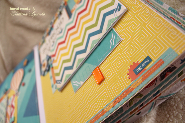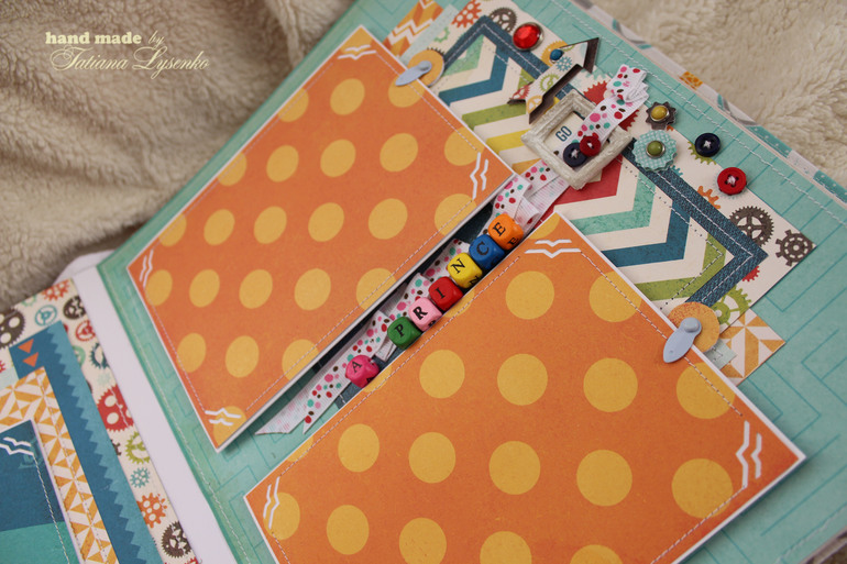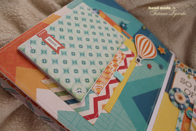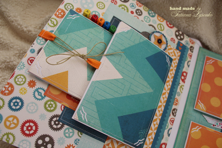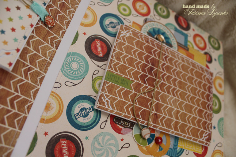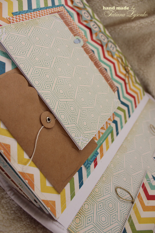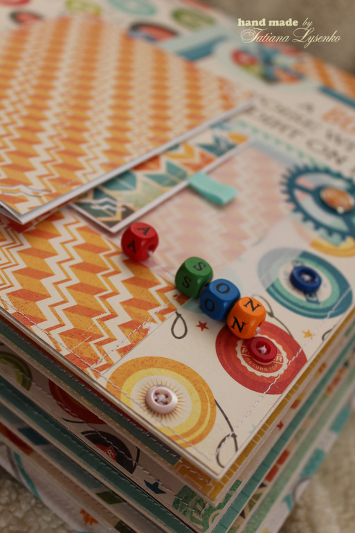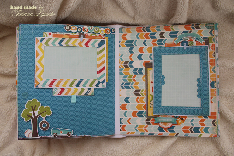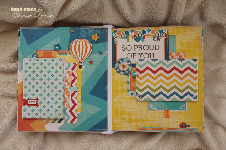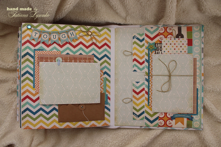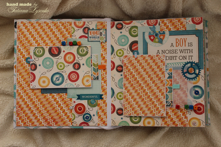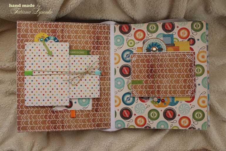 Итак, формат альбома 24*28 см, 6 разворотов (12 страниц). Ручной переплет, обложка обтянута натуральным хлопком, внутри альбом сделан из бумаги Echo Park All about a boy и дополнен красивыми украшениями из той же коллекции и не только. Вмещает в себя 73 фото стандартного размера 10*15 см, а также 14 фото меньшего размера на тэгах. На последней странице альбома есть два больших кармана для дополнительных фото, прочих памятных вещиц. а также оттисков ножки и ладошки. Есть в альбоме карточки для записей на каждом развороте, кармашки для бирочки или других ценностей родителей, а также крафт-конверт, например, для локона малыша. Совсем скоро альбом поедет на постоянное место жительства к крестнику. Итак, приятного просмотра ;)