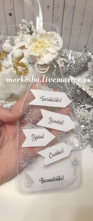 И самая необычная, надо патентовать :) :прозрачная открытка/игрушка на елку с пожеланиями внутри.
