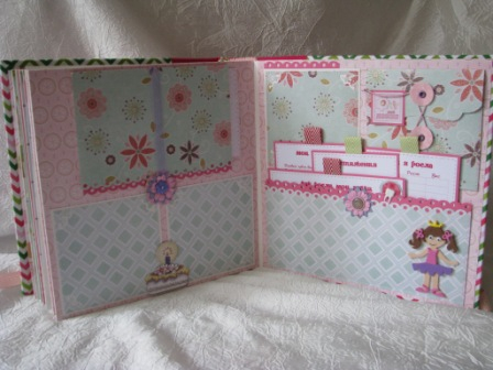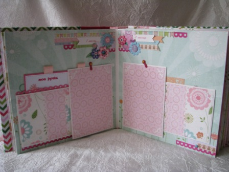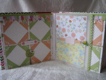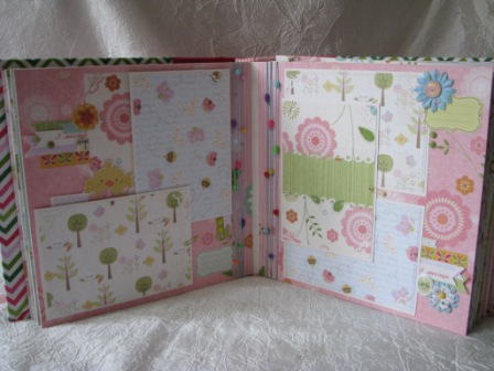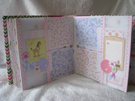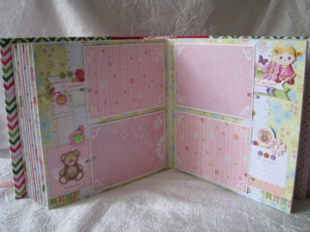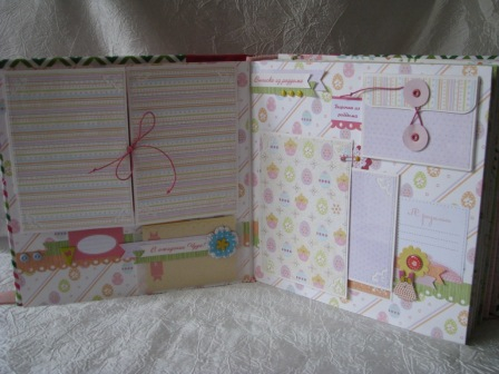 Обложка обтянута американским хлопком,проложен флис. На обложке есть место под фото. Много секретиков-кармашков, есть карточки: мои ручки, мои ножки, достижения, мои зубки, как росли мои зубки, как я росла, конвертики для бирочки из роддома и мой локон. На предпоследней странице имеется книжечка для пожеланий. 1 страница В ожидании чуда, 2 стр. Выписка из роддома, 3 и 4 стр. Моя семья, 5 стр и далее по месяцам, 17-18 стр. Про первый день рождения, 19 стр. Книжечка для пожеланий, 20 стр. Конверт для локона и карман для карточек и других фото или диска.