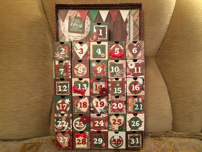 Идея адвент календаря такая, что малыш каждый день, начиная с 1 декабря, будет открывать по одному ящичку и находить там записочки от Деда Мороза с небольшими новогодними заданиями, а так же маленькие игрушки и, конечно же, вкусняшки! Зная своего ребенка, как, в прочем и других деток, конструкцию календаря делала такую, что бы я каждый день могла класть в новый ящичек сюрприз. Это позволит мне корректировать задания, исходя из погодных условий, например, а так же, не даст малышу открыть все и поучить разом все сюрпризы... Итак, смотрим...