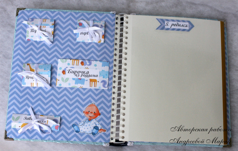 Делался в паре с предыдущим, Размер альбома 20 на 28 см. 20 магнитных листов. Обложка хлопок+джинс+вышивка крестом. Внутри кармашки под бирочку, УЗИ,зубик, локон, прищепку,тэги для записей.