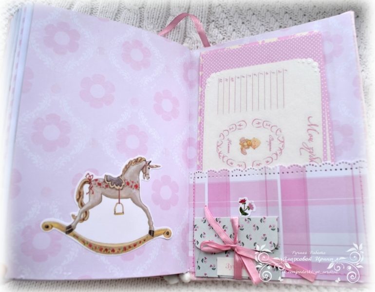 Блокнотик формата А5, 120 страничек, 12 разделителей по одному на каждый месяц жизни новорожденной крошки. Вмещает 14 фотографий - такой получился полноценный "альбомчик".