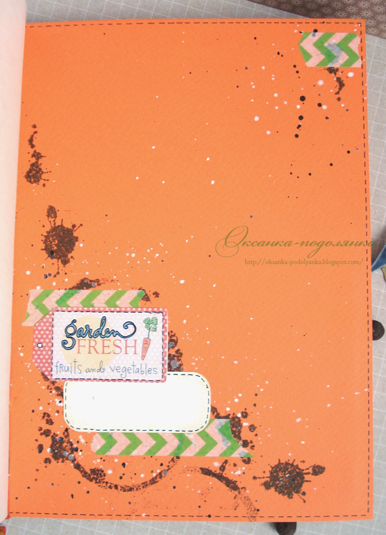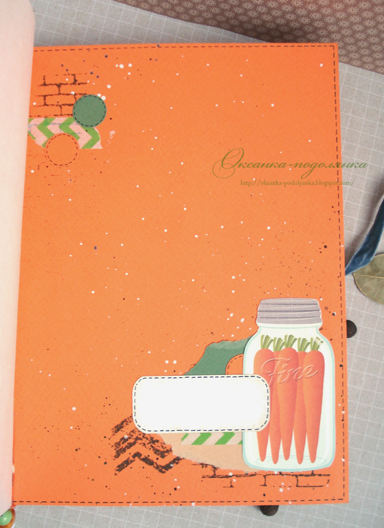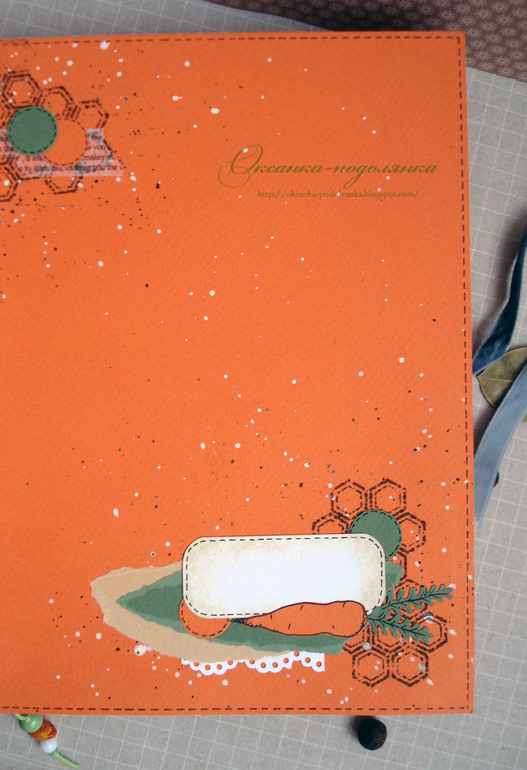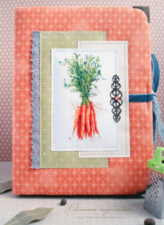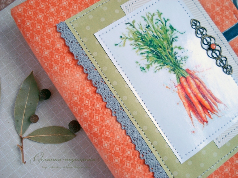 Параметры, как обычно - формат А5, около 130 состаренных листов, пахнущих ванилью ( не знаю, как сделать, чтобы пахнул морковкой)))), каждая страничка проштампована, 4 разделителя, прозрачные кармашки для записочек на разделителях и форзацах.