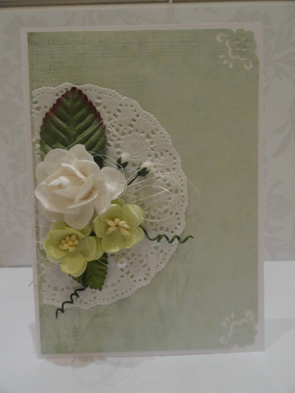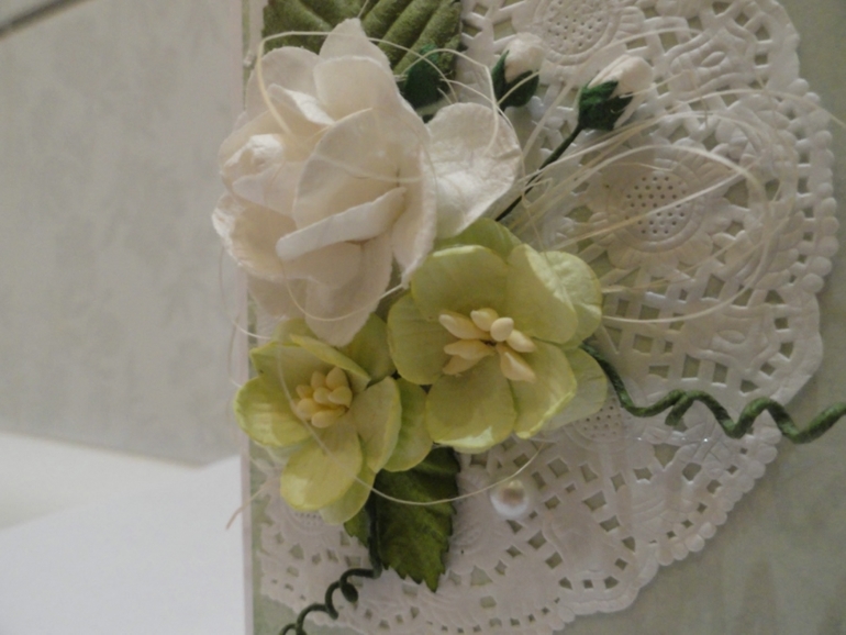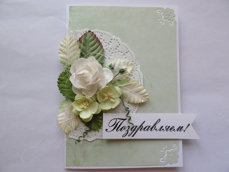Доработала немного открытку. Листики с лева не приклеивала потому немного торчат. Надпись слишком большая, но к сожалению другого штампа нет и распечатать более подходящую надпись пока не могу. Как только появится возможность сделаю ее меньше на том же месте. При приклеивании добаюлю еще немного сизали или небольшой бантик около бутонов с права.