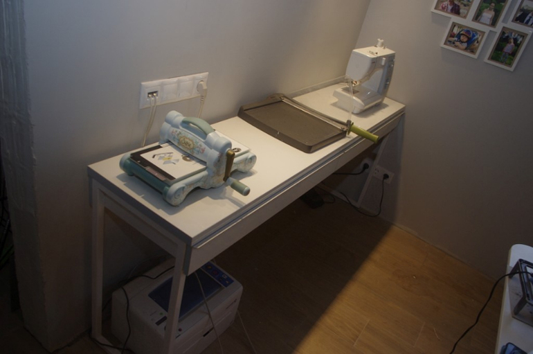 "операционный" стол - БШ, резак и швейная машинка. ножи и швейные принадлежности в ящичках.