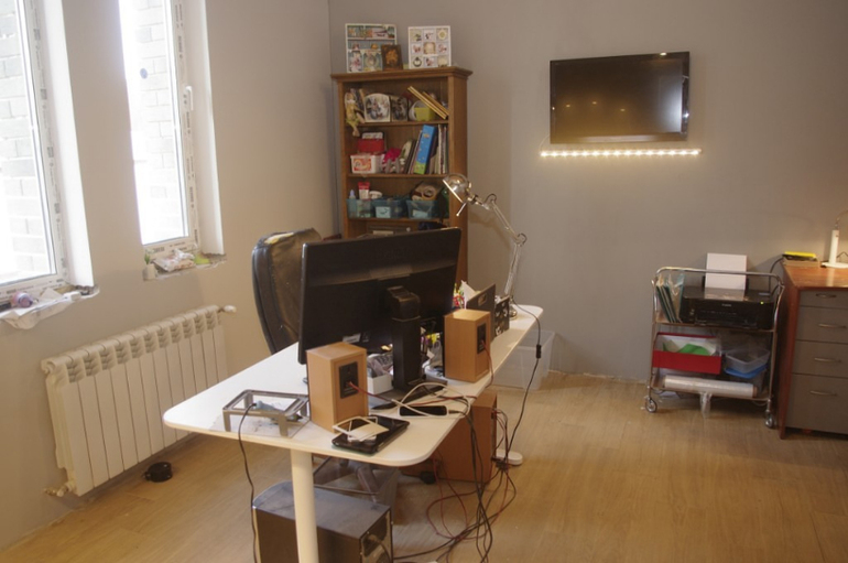 ремонт на 70% сделали, осталось ещё много чего доделать: плинтус сделать, подоконники, шторки и потолок натянуть. ну и дверь потом поставить. мебель практически вся под замену будет, останутся только 2 белых стола, которые специально были куплены, остальное потом со временем поменяю, но пока для работы сойдёт.