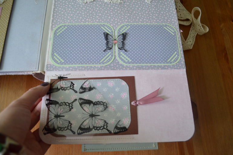 Первый разворот - беременность мамы и рождение девочки. Здесь карманы для фото УЗИ, для диска, метрика.