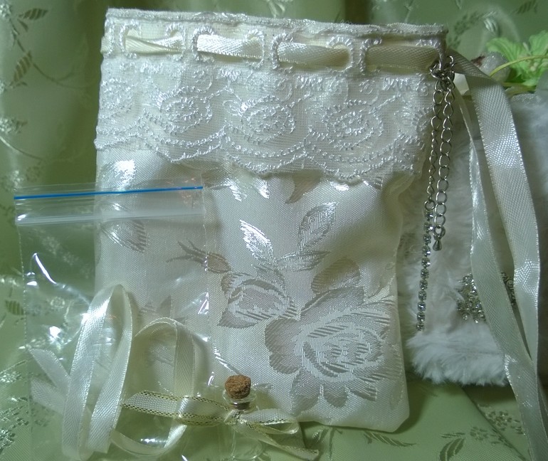 Из этой же тканюшки с добавлением кружева сшила мешочек, внутрь которого по традиции положила маленький бутылек для первого молочного зубика и пакетик с ленточкой для первого срезанного локона: