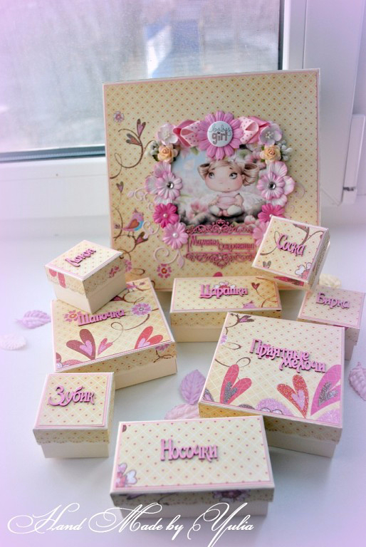 Коробки, шкатулки, комодыВот такая нежно-весенняя сотворилась у меня сокровищница которая теперь ищет себе хозяйку) Размер 21*21см, съемная крышка, на 8 коробочек. По желанию покупателя может дополнится метрикой, местом под фото УЗИ и конвертиком для теста, а так же карточками "Я расту", "Мои достижения" и т.п.