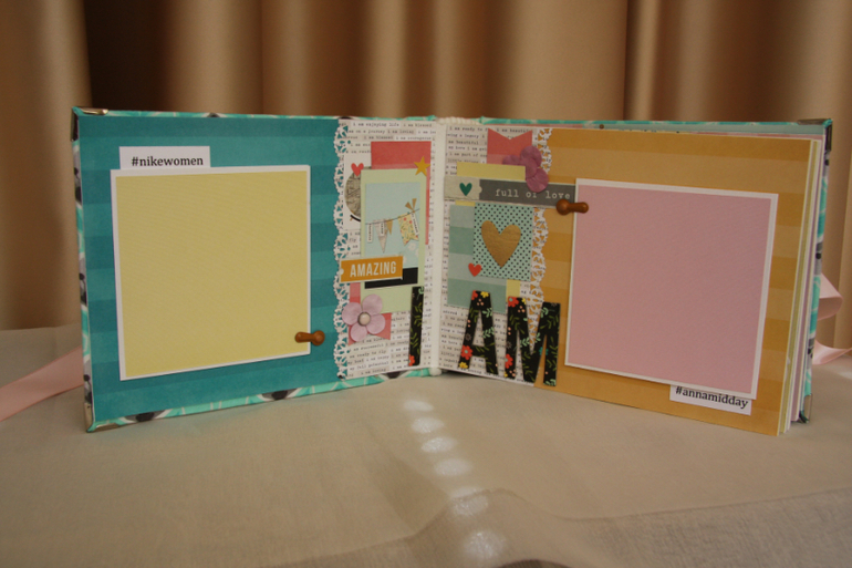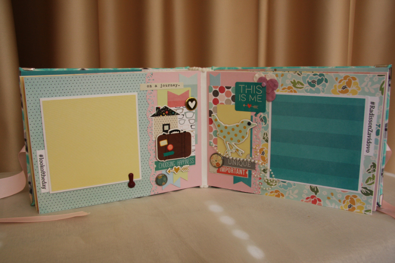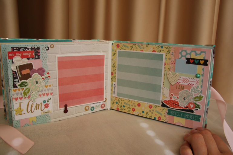 формат 15-20 см, 6 разворотов Бумага "I Am" Simple Stories ,Наклейки, высечки из той же коллекции, бумага "Cut &paste" от ММЕ, брадс ММЕ,