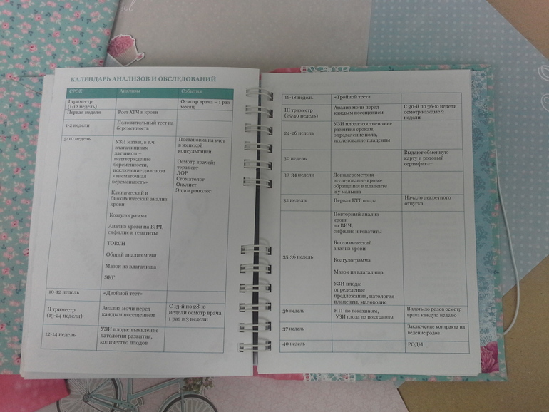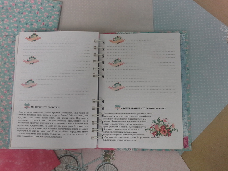 Блокноты10 разделителей, есть кармашки, куда можно сложить направления на анализы, обследования и другие важные мелочи. В ежедневнике имеются советы, календарь беременности по неделям, информация о развитии малыша, графики визитов к врачу, списки покупок для мамочки и малыша. Около 190 страниц