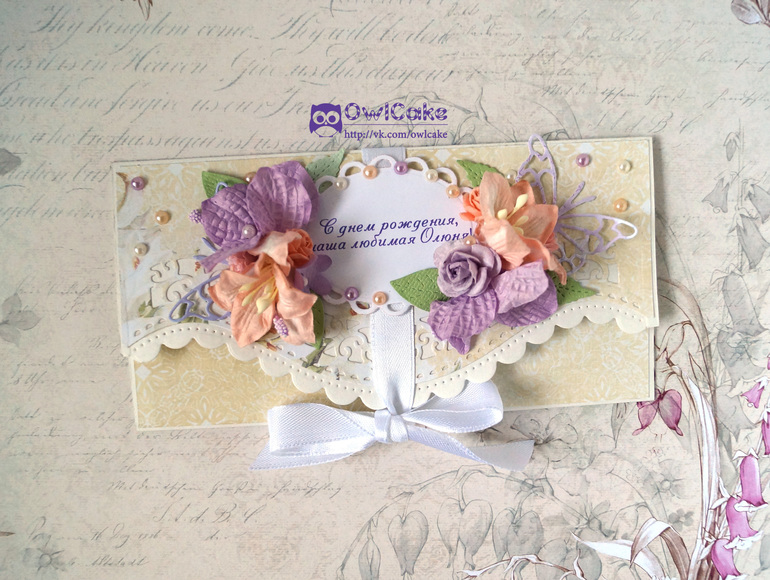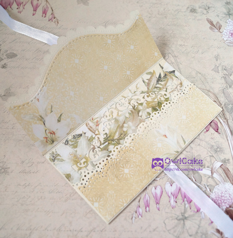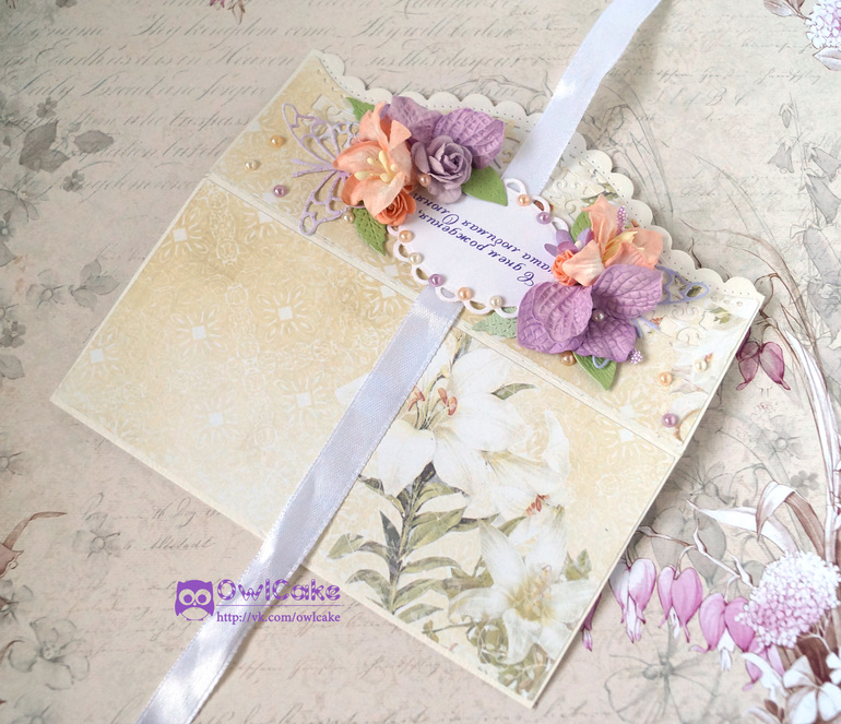 Подарочный конверт "Её величество лилия". Нежный конверт в сиренево-персиковых оттенках с королевскими цветками лилии для утонченной натуры!)Лилии на прите бумаги и в букете, бабочки не хотят улетать из такого благоухающего сада, ведь здесь так хорошо!