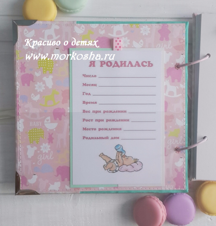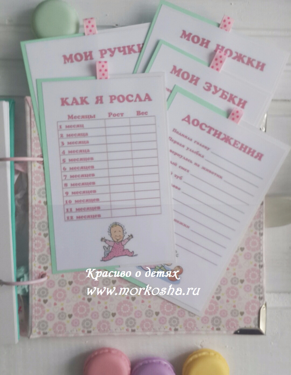 Комплект состоит из фотоальбома 20х20см, 30 листов мятного и перламутрового картона, все необходимые таблицы-наблюдения за девочкой от 0 месяцев до 1 года. Также в комплект входит папка формата почти А4 для первых документов - Свидетельства о рождении, ОМС и Пенсионной карточки.