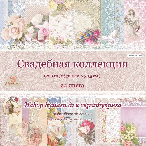 Набор листов для скрапбукинга «Свадебная коллекция» представляет собой декоративную бумагу плотностью 200г/кв.м в нежных пастельных тонах с цветочными орнаментами. Всего в наборе 12 дизайнов по 2 листа каждого. Бумага размером 30.5×30.5 см подходит для декорирования открыток, альбомов или скрап-страниц