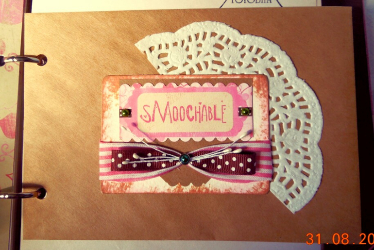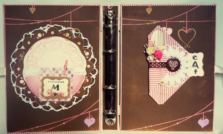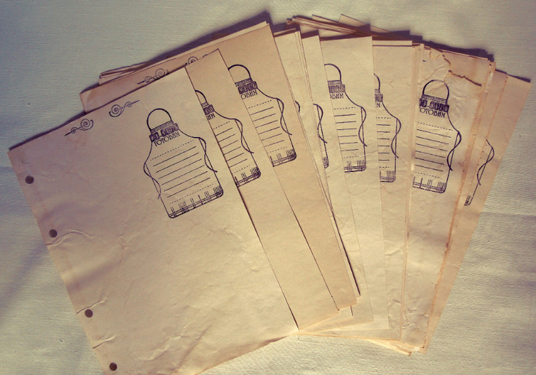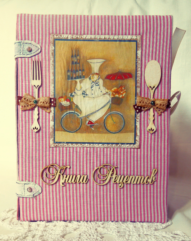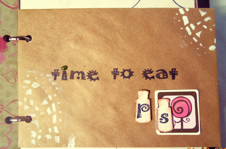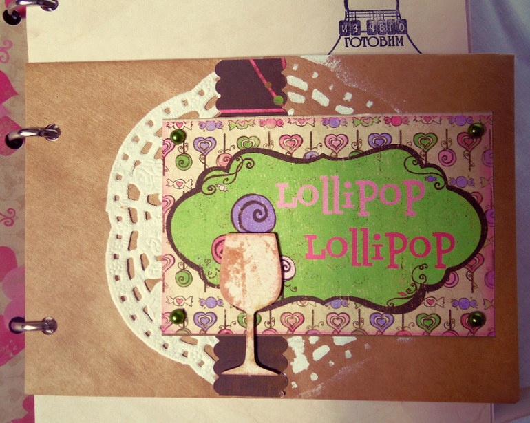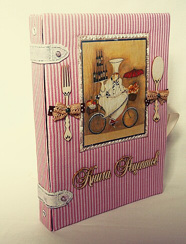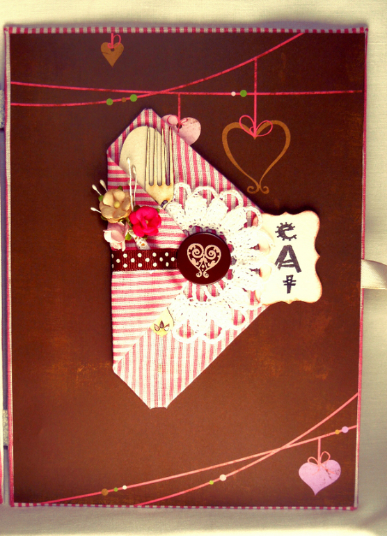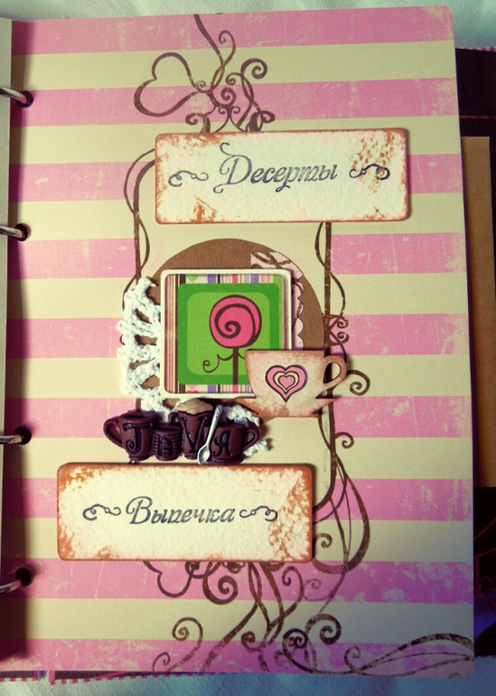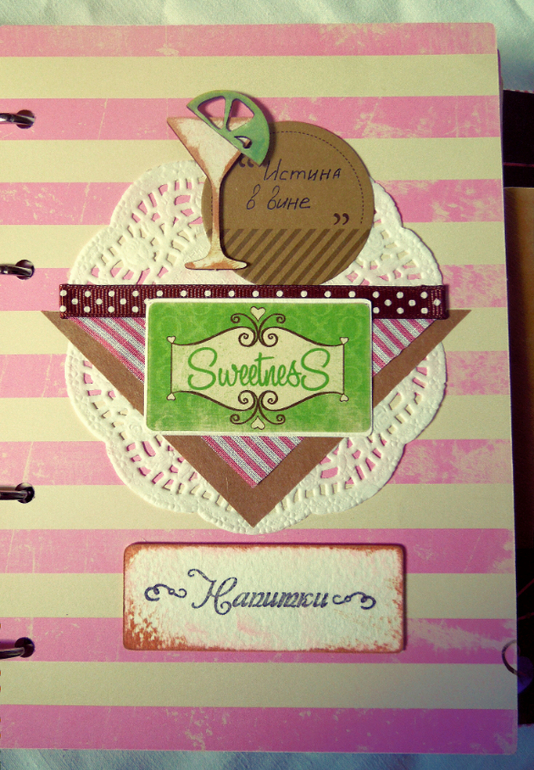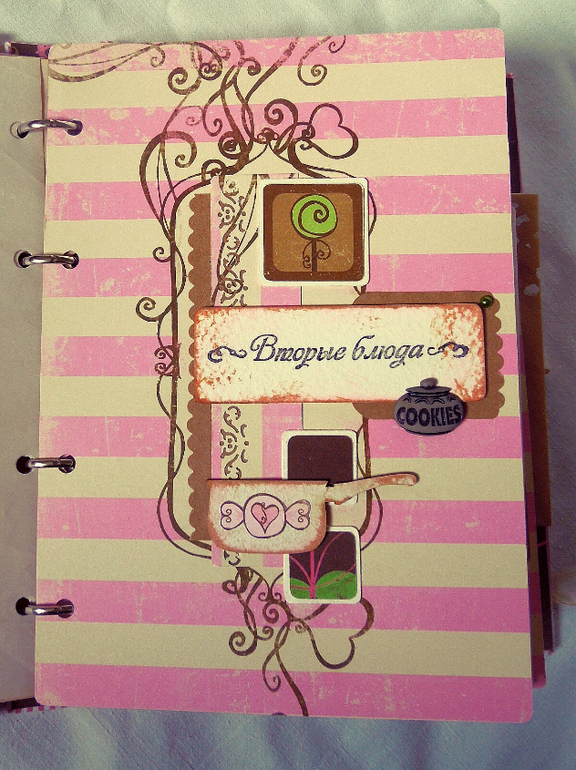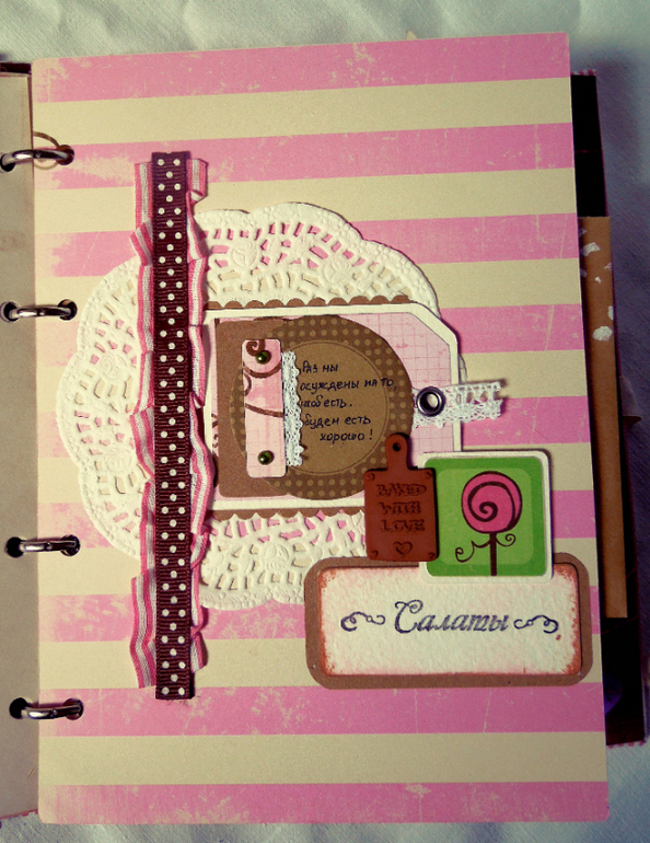 Обложка и корешок крепятся друг к другу с помощью кожаных ремешков, которые привиты и для надежности еще закреплены брадс. Внутри механизм с разёмными кольцами, крепится на люверсах. На первом форзаце кармашек для меню (я перед праздниками, когда предстоит много готовить, всегда составляю меню, вот для них этот кармашек). После каждого разделителя есть конвертик или кармашек, куда можно положить рецептики на листочках. Лично у меня куча рецептов, записанных на разных листочках, а переписывать лень:-). На обратной стороне разделителей планирую склеить фото. У меня есть интересные фото из семейного архива про приготовление еды. Ну в общем то все. Критика, советы и замечания принимаются:-)