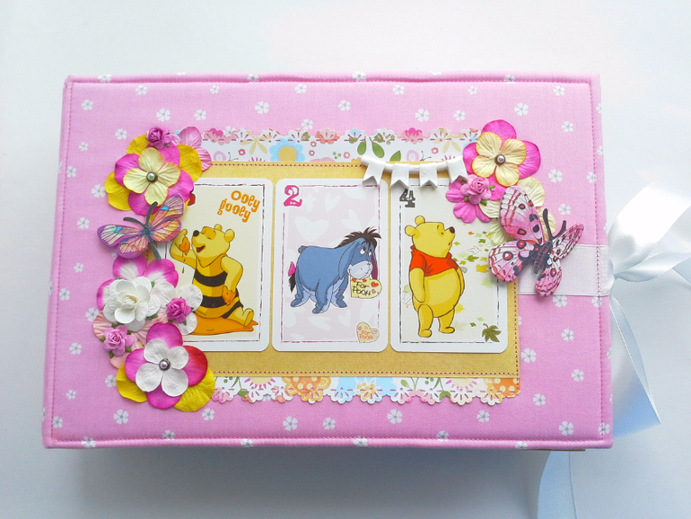 Альбомы ДетскиеАльбом для девочки до года. Получился очень яркий, с множеством мелких и крупный деталей. Размер 19х27см, 6 разворотов, толщина корешка 7см. Обложка из хлопка с флисом. Альбом без подложек под фото,но по желанию их можно сделать, либо уголки(получится не более 36 фото)