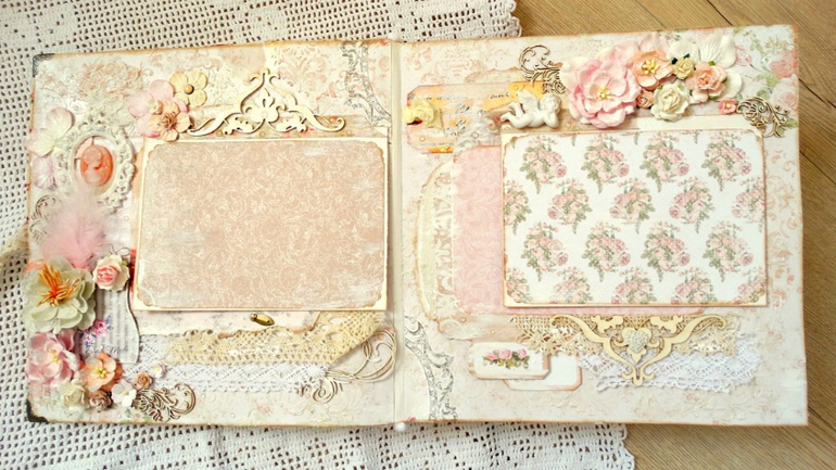 Когда я создавала тот альбом в подарок на 60 лет моей маме (а она у меня стильная красавица 47 кг:)), вложила в него всю любовь и благодарность за все, что она мне дала, за все, что делает для меня и моих деток. Все страницы покрыты текстурной пастой, тонированы жемчужным спреем, многодетальны и многослойны. Я мечтаю повторить его в еще более винтажном и более шебби- варианте, благо есть все материалы, закуплены кружева и цветы, только время не продается:)
