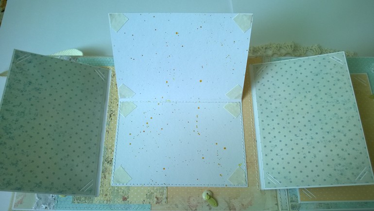 Коллега захотела альбом на большое количество фотографий, а бумаги мне не хватало, поэтому я внутри картон побрызгала акварелькой и приклеила прозрачные уголки).