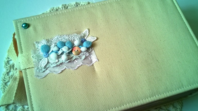 Спинку чуть приукрасила - закрыв пришитую ленту и вставила по уголкам брадсы, альбом получается как на небольшой подставочке и не переваливается из стороны в сторону из-за пришитого декора.