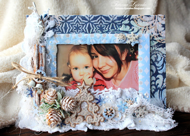 Рамку я максимально разобрала и декорировала бумагой BoBunny, в которую влюбилась еще в прошлом году. Для того, чтоб добавить фактурных переходов, цветовых переливов и мерцания, я использовала продукцию ТМ Фабрика декору, без которой теперь не представляю своих работ вообще.