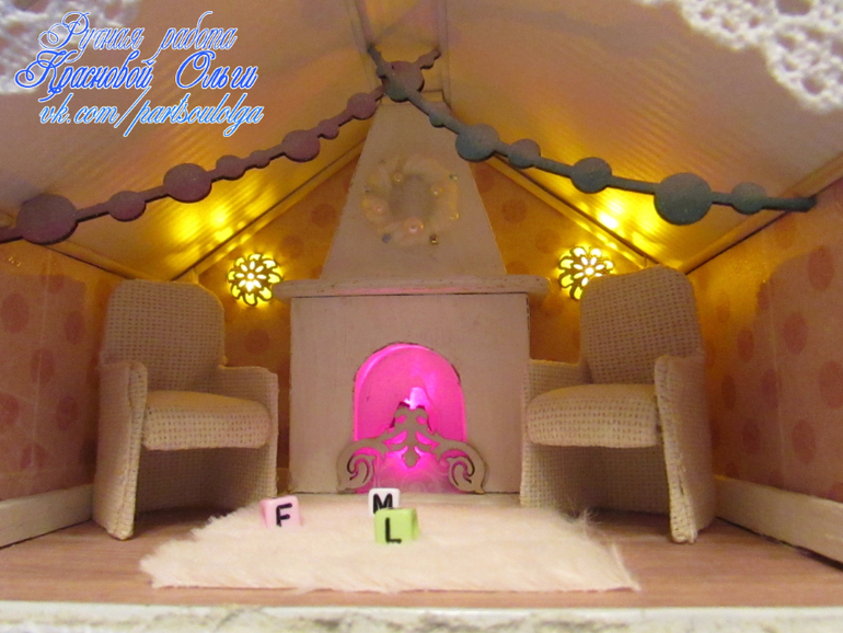 Домик разделен на локации. Внизу: подарки в уютной упаковке, коньки. Даже взрослый ждет подарки под Новый год!
