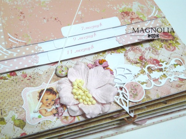 2 разворот для фото первого года жизни по месяцам (12 фото 10*15 см), предусмотрены карман для бирки и карточки из роддома, теги для записей по каждому месяцу