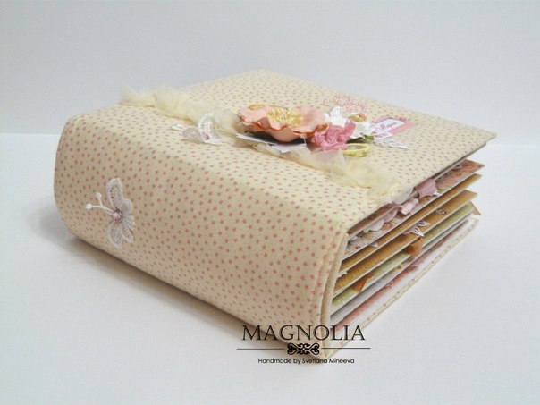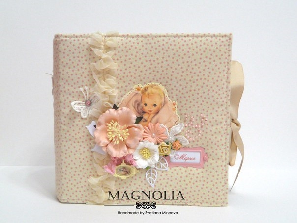 Итак, альбом для Марии, формат 21*21 см, тканевый прошитый переплет по МК Светочки Ковтун. Обложка мягкая тканевая (натру.хлопок), состоит из 7 разворотов (14 страниц), вмещает 69 фото 10*15 см и 22 фото 10*7,5 см (оформлены в виде тегов)