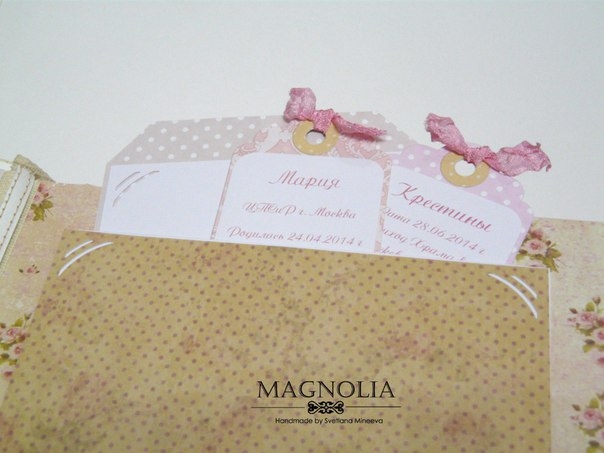 Предусмотрены различные теги с данными (при рождении и крещении) и для записей в ожидании, с 1 по 12 месяц, 2 года и 3 года; карманы для фото узи, бирки и карточки из роддома