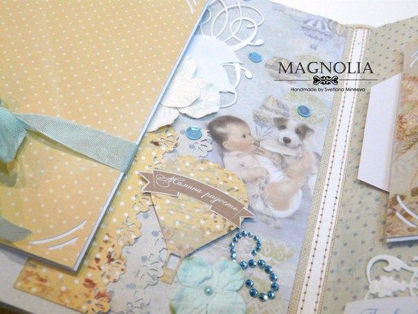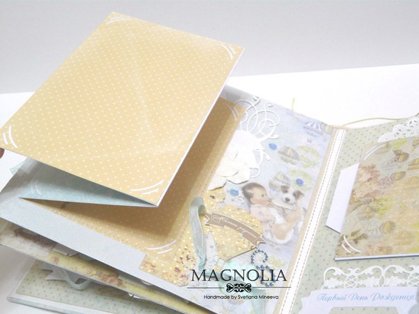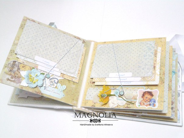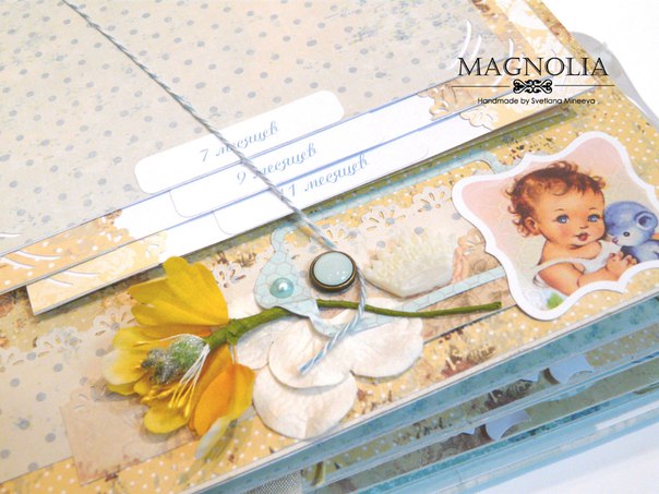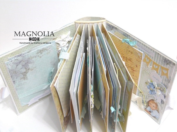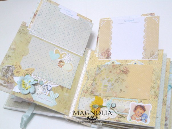 2 разворот, для фото первого года жизни по месяцам (12 фото 10*15 см), предусмотрены карман для бирки и карточки из роддома, теги для записей по каждому месяцу