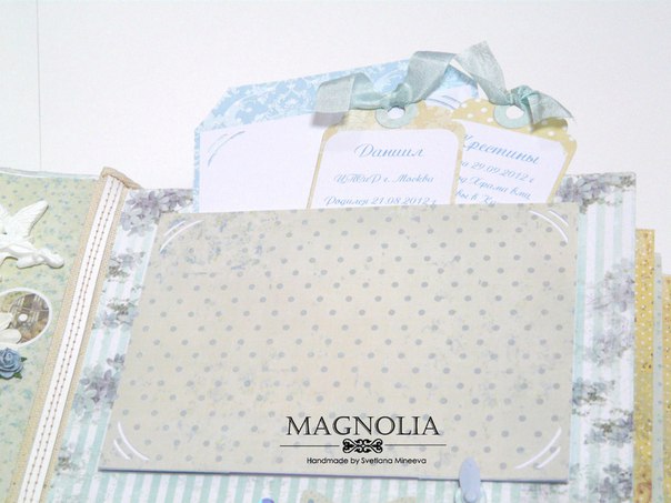 Предусмотрены различные теги с данными (при рождении и крещении) и для записей в ожидании, с 1 по 12 месяц, 2 года и 3 года; карманы для фото узи, бирки и карточки из роддома