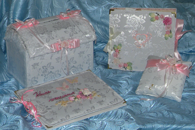 Продаю свадебный набор. Сделала для свадебного салона, но там пока он лежит, вот решила попробовать через интернет. В набор входит: Сундук для денег 1500р., Книга пожеланий 1200р., Подушечка для колец 500р., свадебный альбом 27х29 на 5 разворотов (примерно 40 фото 10х15 и 15х20) 3000т.р.