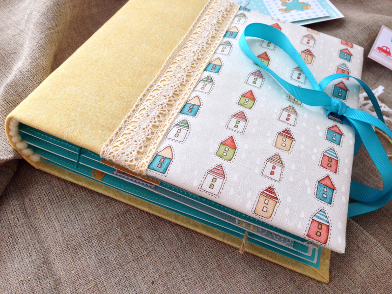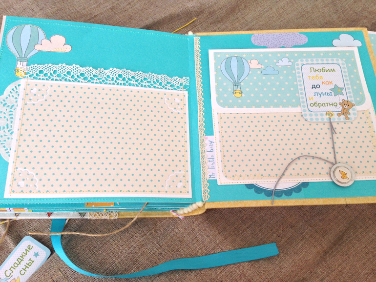 Альбомы ДетскиеХочу показать детский альбом для мальчика, который я сделала на продажу. И теперь он радует замечательного мальчугана и его родителей. Альбомчик в нежных бирюзовых тонах, сделан с нуля, в твердом переплете с мягкой обложкой из хлопка. Очень удобный размер 21*20,5*5,5 см, альбомчик приятно держать в руках :love: Пять разворотов вмещают 31 фото, 8 больших кармашков (куда так же поместятся дополнительные фотографии), "секретный шкафчик" на завязках для важных записей и мини-фотографий. В кармане карточки с мальчуковыми надписями и тежики для оформления фотографий.