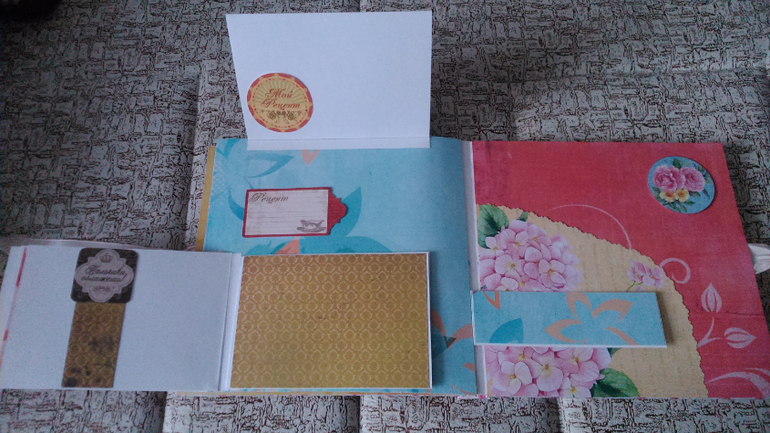 Книги пожеланий, чековые книжки, книжки желаний, кулинарные книгиЗдравствуйте! Прошу оценить мой первый кулинарный альбом. Размер 20*20 на 4 страницы, в нем множество кармашков, где и будут хранится рецепты.