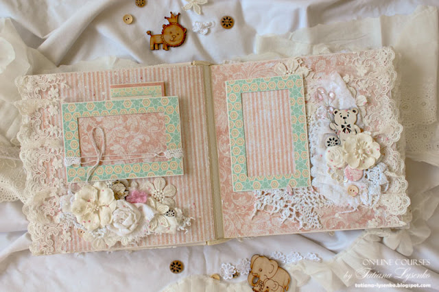 В альбоме прочный и надежный переплет С.Ковтун. 5 разворотов, 35 мест для фотографий форматом 9/13 см, карманы и маленькие блокнотики для записей самого важного родителями о развитии своего маленького ребенка. Декорирован большим количеством натурального кружева, текстиля, шебби-лентами, деревянными пуговицами и гипсовыми украшениями.