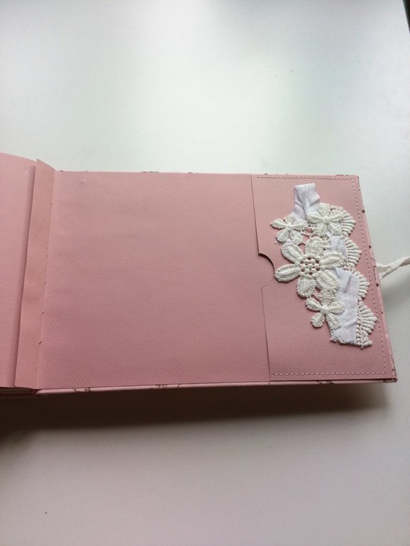 Альбом нежно розовый 23х16см на 26 листов, Имеет доп.карман для фото, внутри розовые и белые листы.