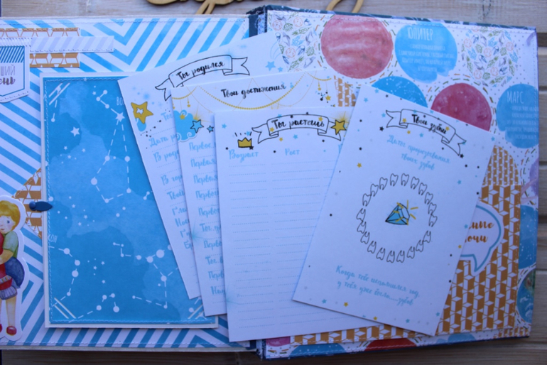 Альбомы ДетскиеОооочень мне нравится эта бумага, столько работ уже из нее сделала (папочки для детских документов, сокровища, бэбибук). И вот еще одна работа. На этот раз - альбом первого года жизни для мальчика.