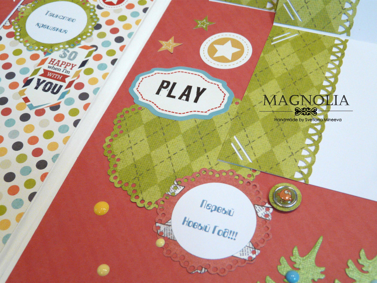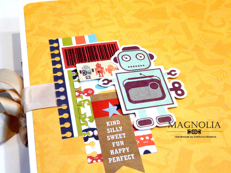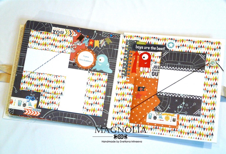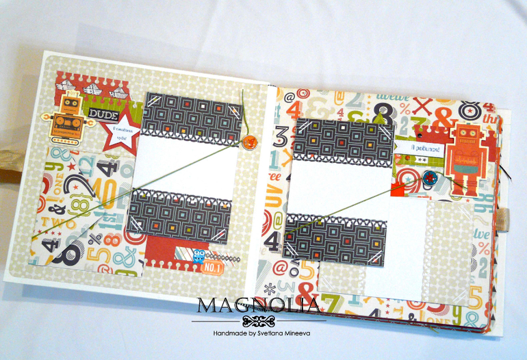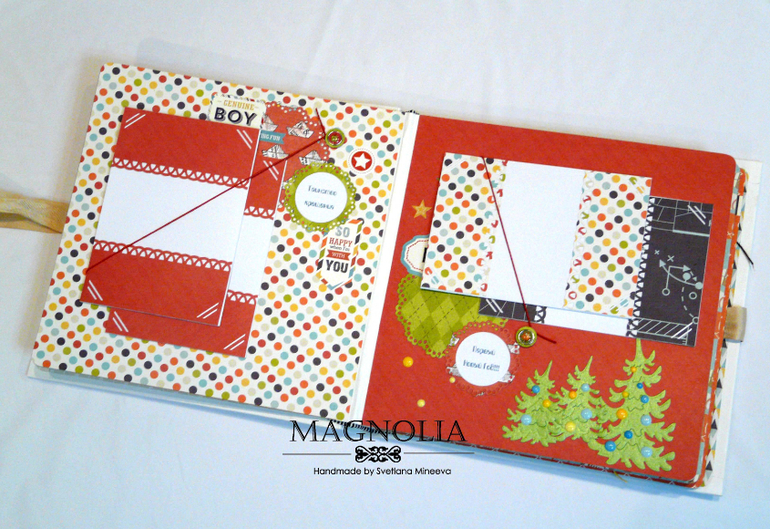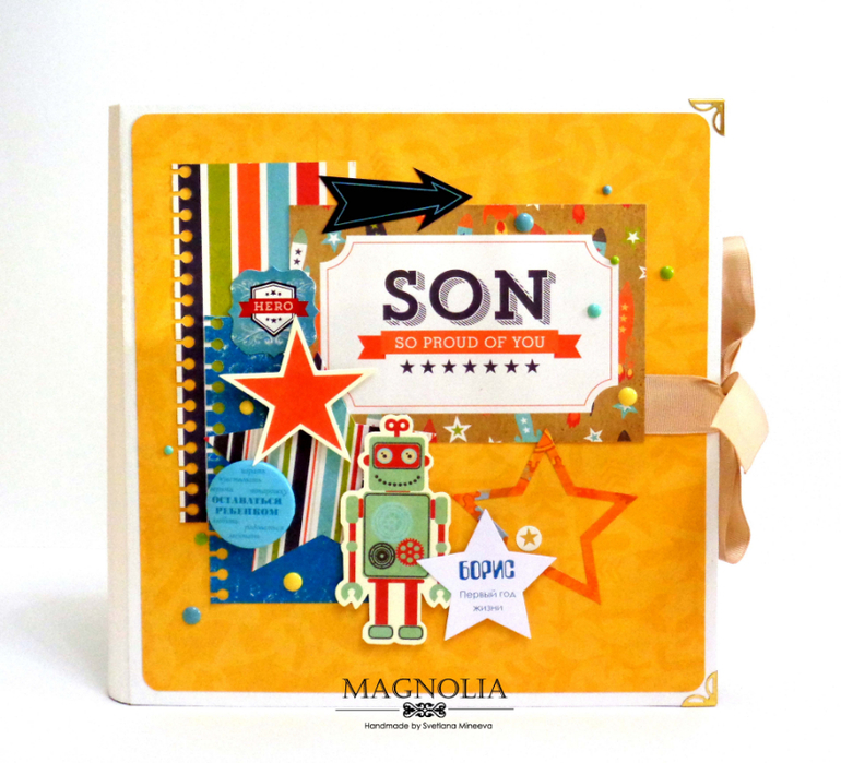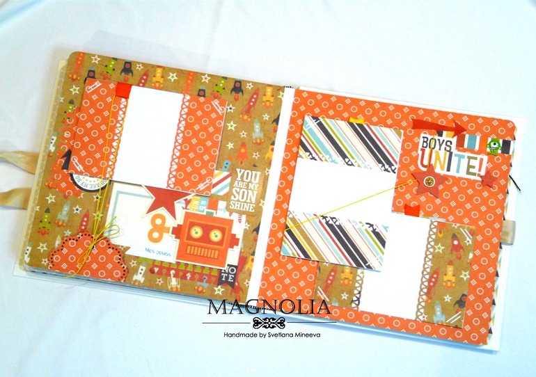 А я сегодня с ярким мальчуковым альбомом для мальчика. Формат 25*25 см, обложка бумажная, 5 разворотов (10 страниц). Разделён на темы: в ожидании, я родился, крещение, первый Новый год, моя семья, мои путешествия, первый День Рождения
