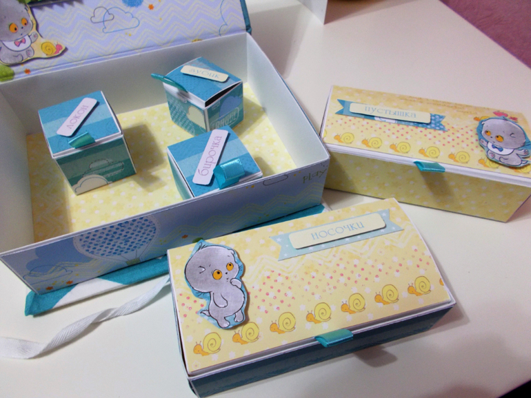 Коробки, шкатулки, комодыВот такая сокровищница сотворилась из бумаги от Скрапмир. Размер 15х20см. Внутри 5 коробочек для соски, локона,бирочки, зубика и носочков.