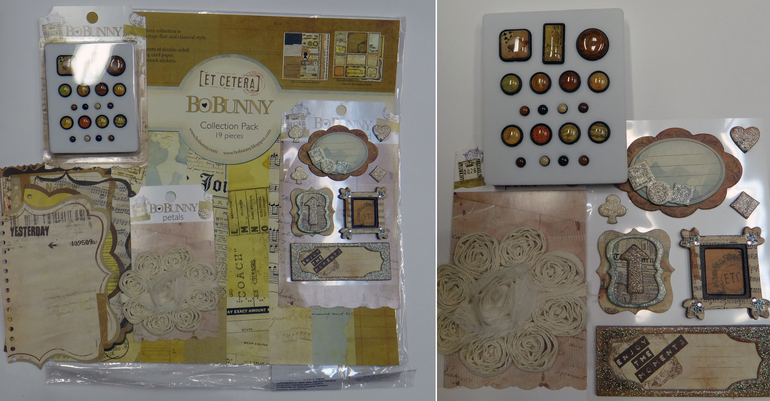 1. BO BUNNY (2300р) Полный набор бумаги, комплект брадс, украшение из лент, набор чипборда: