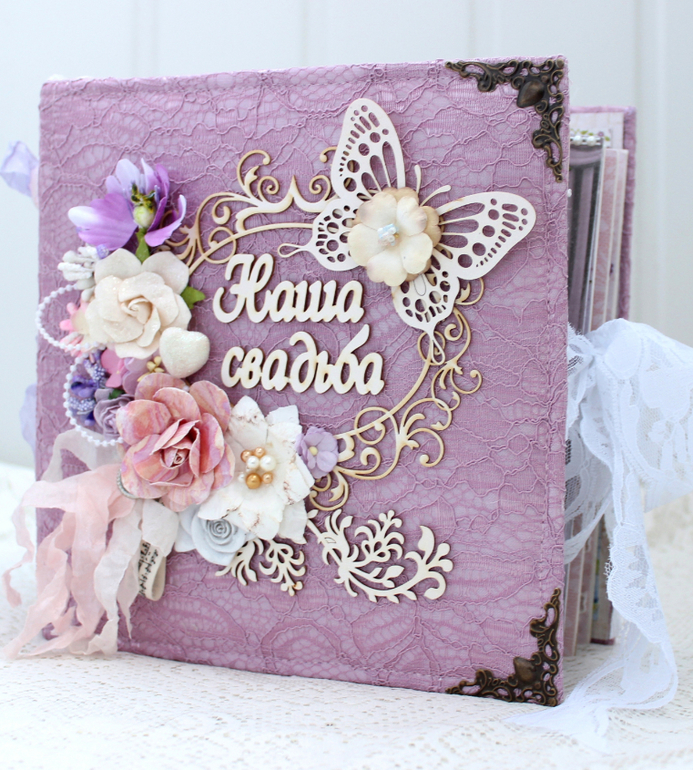 Альбомы СвадебныеПривет всем) А я к вам со свадебным альбомом в сиренево-розовых тонах) Формат альбома 20х20, толщина альбома 11 см, на 6 разворотов ( 12 страниц+ дополнительная откидная страница), рассчитан на 60 фотографий. Кружевная обложка, множество цветов Prima, чипборда, кружевных элементов, лент и др. украшений. Альбом есть в наличии)
