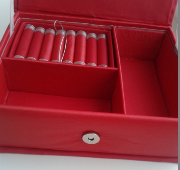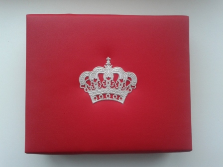 Использовано в вида материи: кож зам (донышки, крышка и крайние валики) и плащевая ткань. Минимум декора: серебристая лента на валиках, она же в качестве канта и удерживающей ленты и серебристая корона на крышке. Корона - это термоапликация, которая была куплена лет 5 назад (в то время я даже слова скрапбукинг не слышала). Она пришита леской ))) В коробочке 3 отделения и одно съемное для колец. Закрывается на магнитный брадс