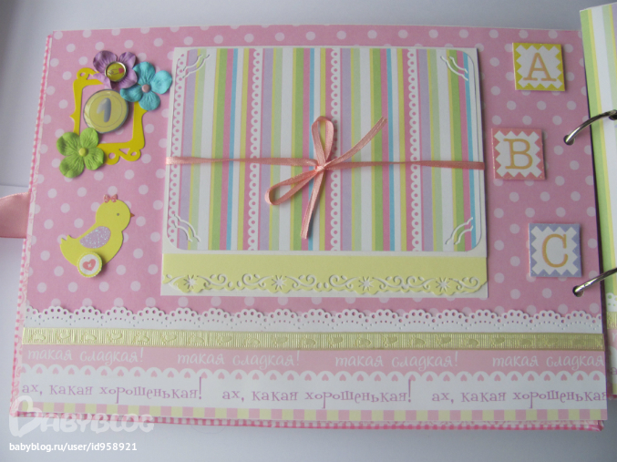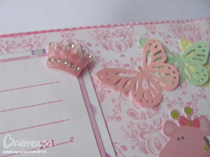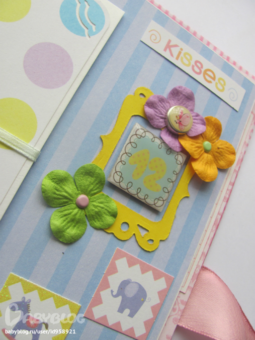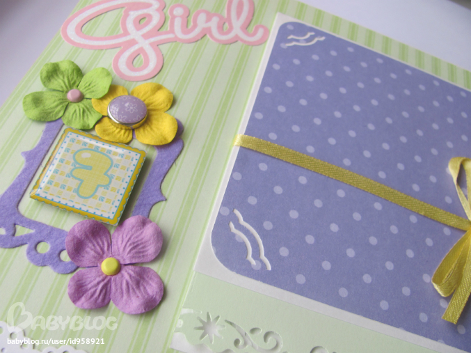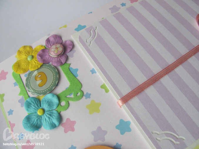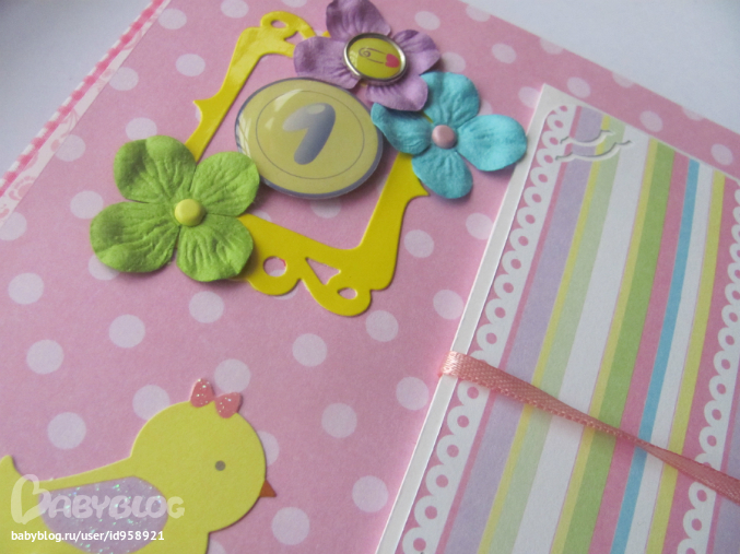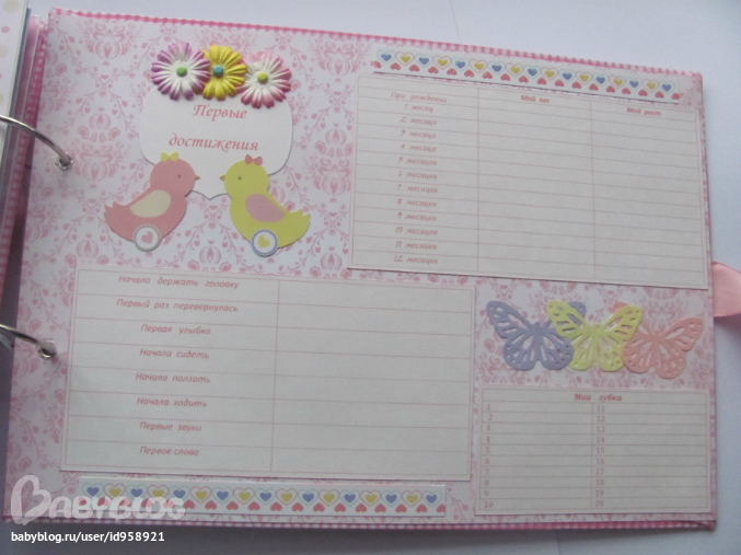 На последнем развороте - место для 3 фото ребенка в 1 годик (можно поместить фото с первого дня рождения малышки)+ таблички для записей важных этапов жизни малышки,где можно записать вес,рост,когда начала сидеть,первые слова,даты появления первых зубок..