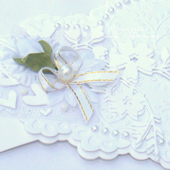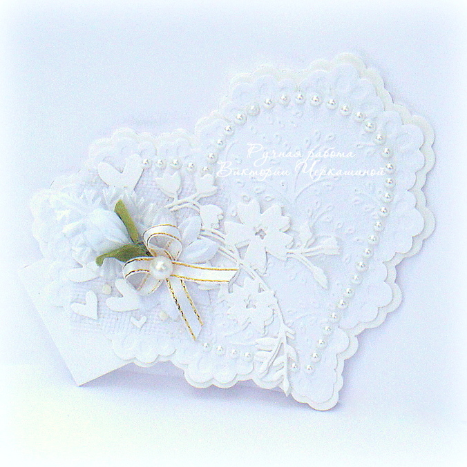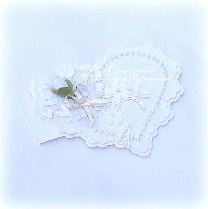 Продам изысканную свадебную открытку в форме сердца, выполненную в оттенках белого цвета. По Вашему желанию, могу дополнить открытку внутри кармашком для денежной купюры, а также поздравительным текстом.