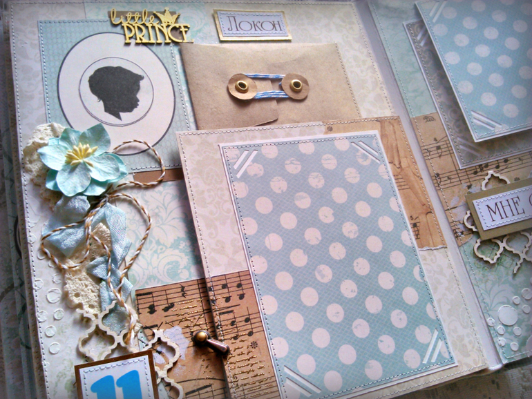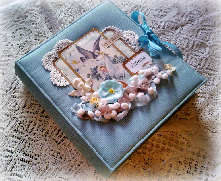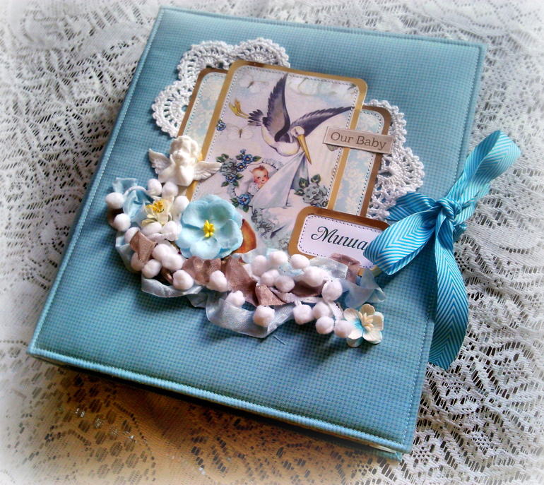 Альбомы ДетскиеЗдравствуйте, Друзья! Готов новый альбом, на этот раз нежный и воздушный для мальчика Мишеньки. Заказчики попросили сделать его в мятно-голубой, бежевой гамме. Альбом размером 23*26 см, в мягкой тканевой обложке, вмещает около 40 фотографий. Бумагу использовала австралийского производителя Kiser Craft, уже полюбившейся мне по прошлой работе с коллекцией для девочки. Дополнила бумагой от Prima. В альбоме есть карман для бирочки и локона, карточки развития и роста малыша и раскладные элементы, а также много украшений.