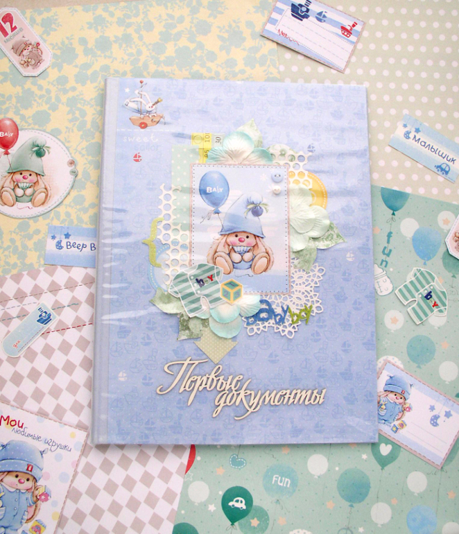 Вторая обложка для мальчика, это я так решила утилизировать оставшиеся листочки из набора. Она большая "в полный рост", закрывается на магниты! Первый мой опыт!