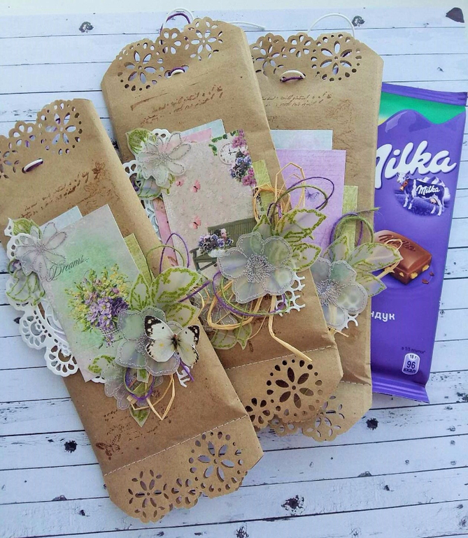 ШоколадницыА вы одариваете своих преподавателей (знакомых, мастера по маникюру, парикмахера, косметолога, тренера и др.) вкусненьким презентом к празднику? И мы так делаем)) В этом году приготовили для них вкусный презент в виде шоколадницы-конверта. В прошлом году было немного печальное высказывание о том, что упаковку приходилось разрывать, поэтому сейчас сверху были сделаны отверстия и перевязаны красивым шнуром. Теперь можно достать шоколадку не повредив упаковки) А еще там можно что то хранить)))