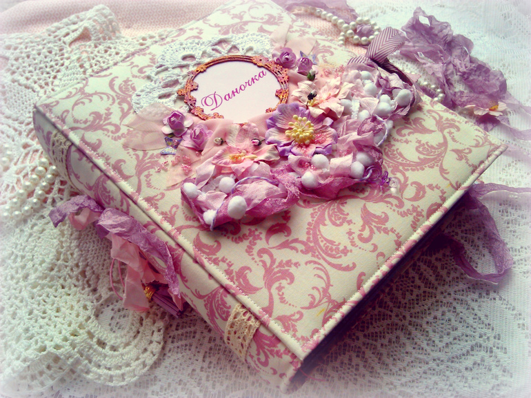 Альбомы ДетскиеВсем доброго времени суток!! Нежный альбом для Даночки совсем скоро уедет к своим обладателям в г.Моздок. Здесь новый прошивной переплет с идеальным корешком! Он по стоимости дороже и более трудоемкий, но того стоит! Здесь будут храниться фотографии Даны с рождения и до 3-х лет. Альбом вмещает около 35 фото 9*13, размер его 22*26см. Здесь украшена не только обложка, но и корешок. Нежная лиловая палитра в сочетании с розовым, сиреневым, голубым, бежевым и белым полюбилась мне безумно! Бумага от Фабрики Декора Надеюсь, альбомчик понравится хозяевам! Как всегда, делала с Любовью!