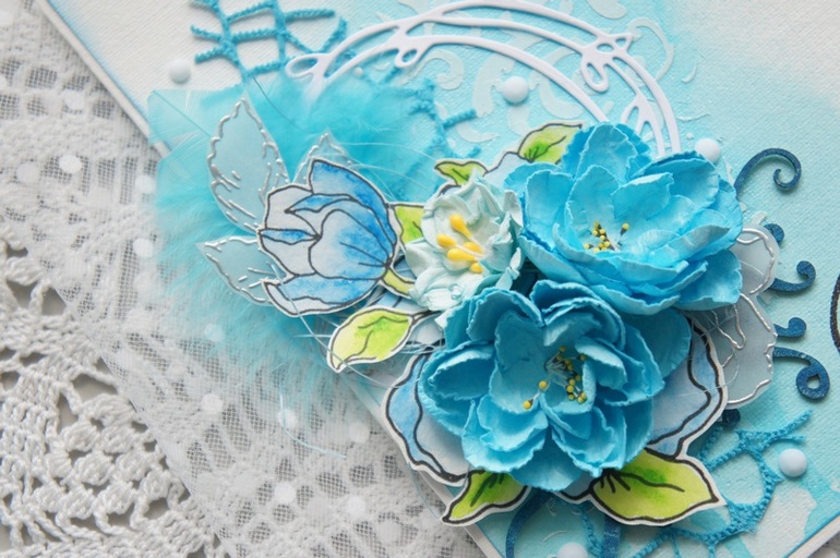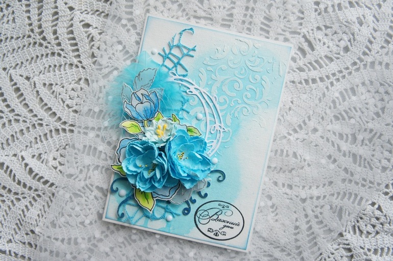 Открытки, приглашения, визиткиВсем добрый вечер. Свадьбы бывают разные...., а бывают и лазурные. Фон с помощью спреев от "Фабрики Декору". Раскрасила вырезки от "Фабрики Декору". Штампинг на кальке. Цветочки ручной работы. Каждый раз, используя спреи, до конца не знаешь что получится.
